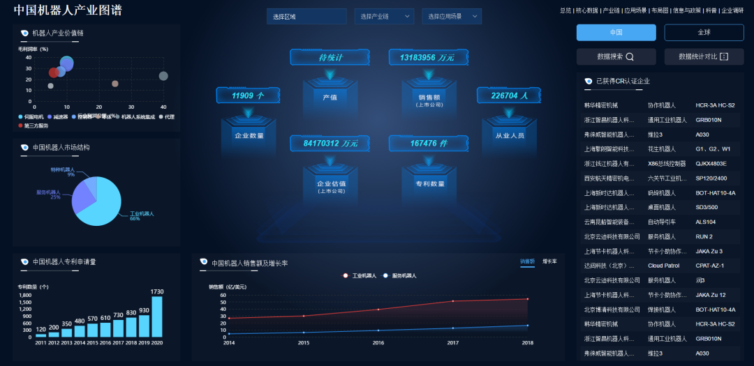 机器人产业图谱不仅涵盖了全球机器人产业宏观数据,覆盖核心机器人米兰·(milan)中国官网企业市场份额占比、机器人市场结构、机器人销售额及增长率等系列宏观数据。而且展示了中国各省市机器人产业的详细情况,包含了机器人企业数量、专利数量、销售额、增长率、已获得CR认证企业数量等核心数据。