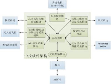 多元信息采集系统用 C++实现各传感器的通信和与地面站通信系统的建立,分为八个功能模块和一个总控模块,以实现各个功能性硬件、处理单元与操作端的互联互通。